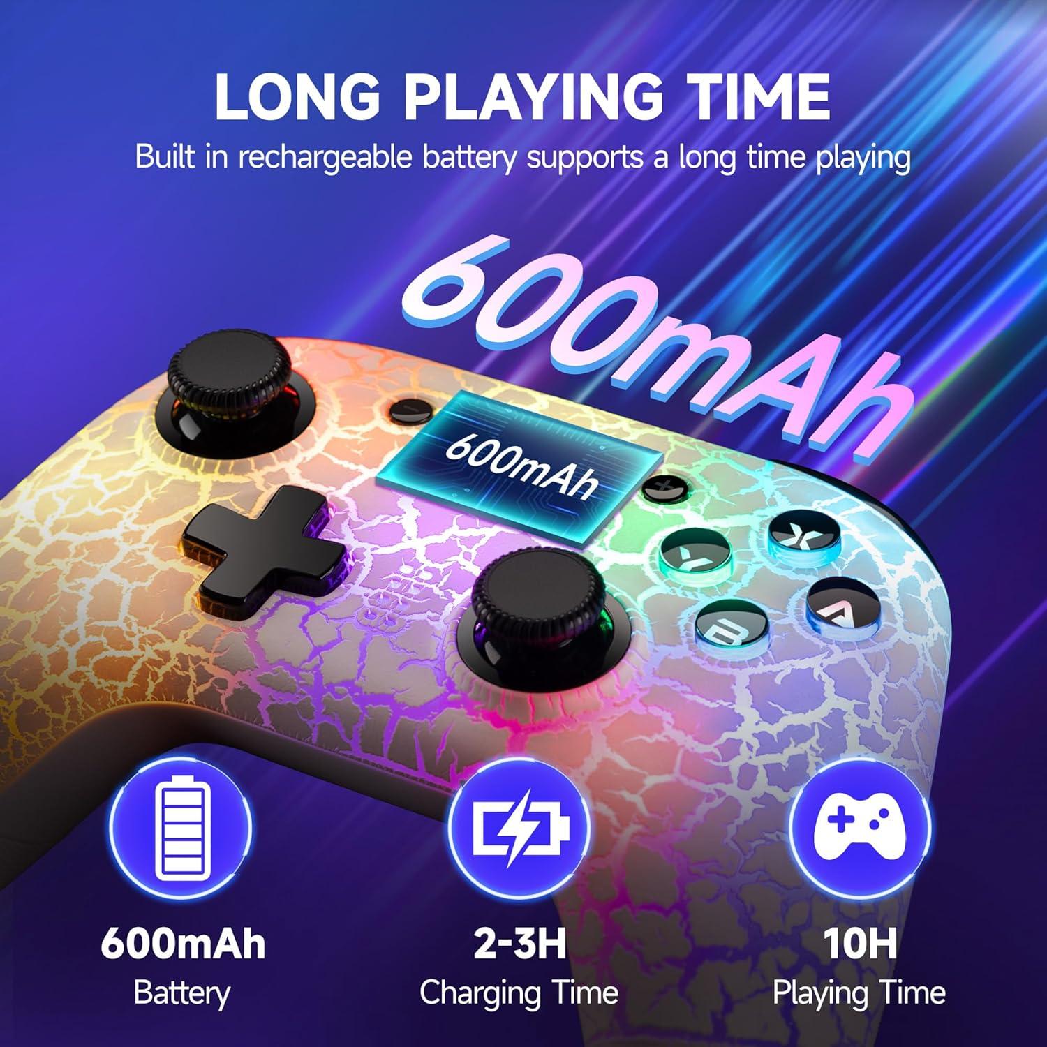 【Bluetooth Controller & 600mah Battery】The pro controller switch support wired and wireless connections, it provides stable and reliable signal without delay or drop-off within 8 meters. Built-in 600mAh battery can provide you with up to 10-15 hours of gaming time, but it just needs 2-3 hours to charge.