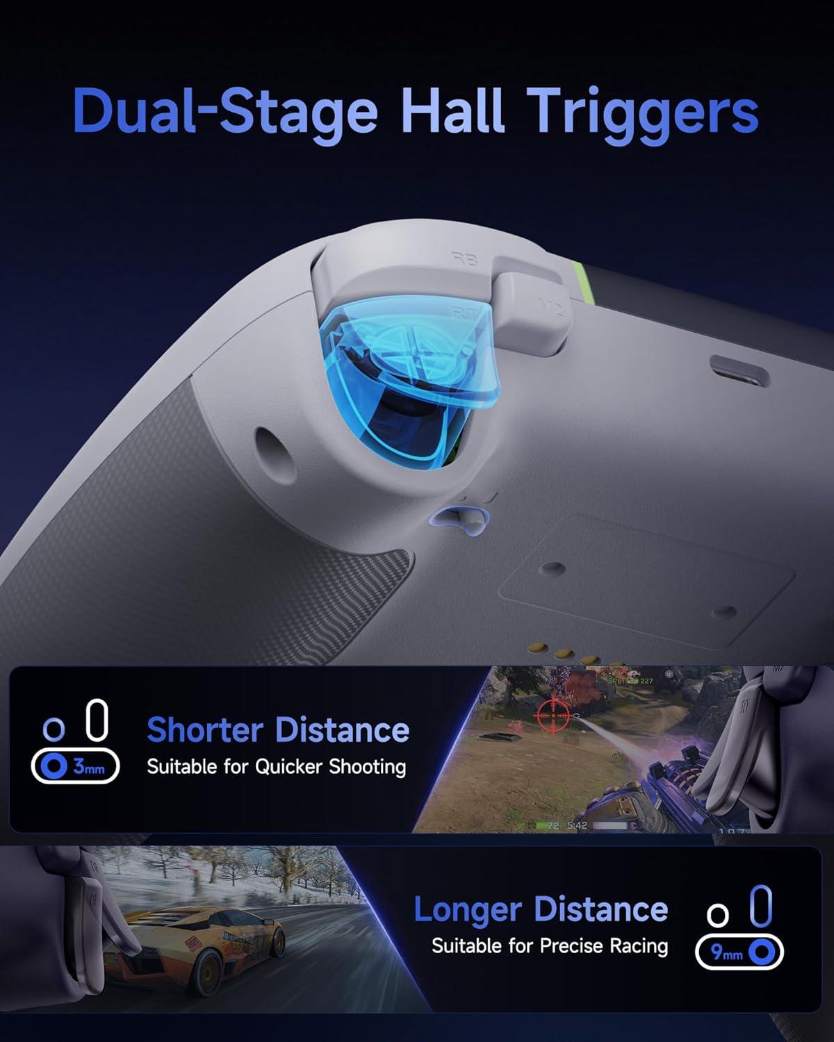 Dual-Stage Impulse Triggers – Adjustable trigger lock for long or short travel, paired with 2+2 built-in rumble motors for realistic recoil, drift, and collision feedback. Ideal for pc gaming controller users who want immersive racing or FPS experiences.